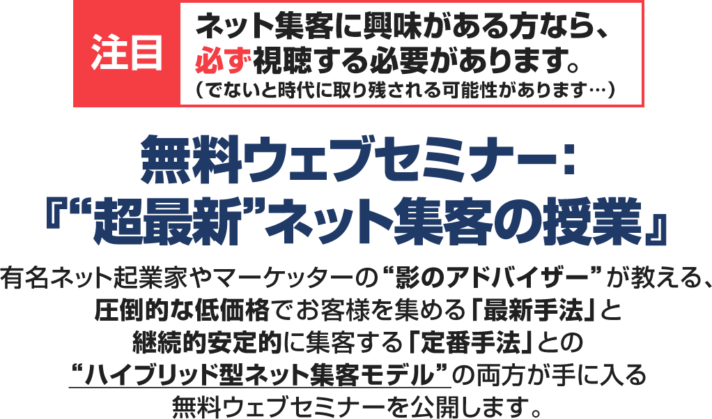 今現在、GoogleやFacebookの広告事業責任者と直接話す機会を持つことができる一部の広告代理店にしかシェアされていない新しい集客モデルを無料ウェブセミナーで公開します。
